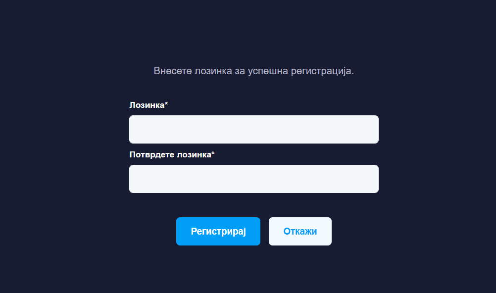 5. По пристапување на страната за регистрација потребно е да внесете лозинка и да ја потврдите истата. После успешно внесените податоци одите на најава.