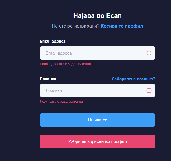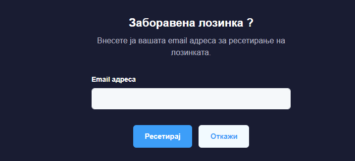 Во случај да ја заборавите лозинката потребно е на најавната страна да пристапите кон линкот "Заборавена лозинка?" . Ќе ви се отвори форма за внесување на е-маил адреса. Откако ќе ја пополните формата проверете ја вашата е-маил адреса. Ќе добиете порака со линк за ресетирање на лозинката. Ќе ви се отвори форма иста како при регистрација да внесете нова лозинка и да ја потврдите истата лозинка.